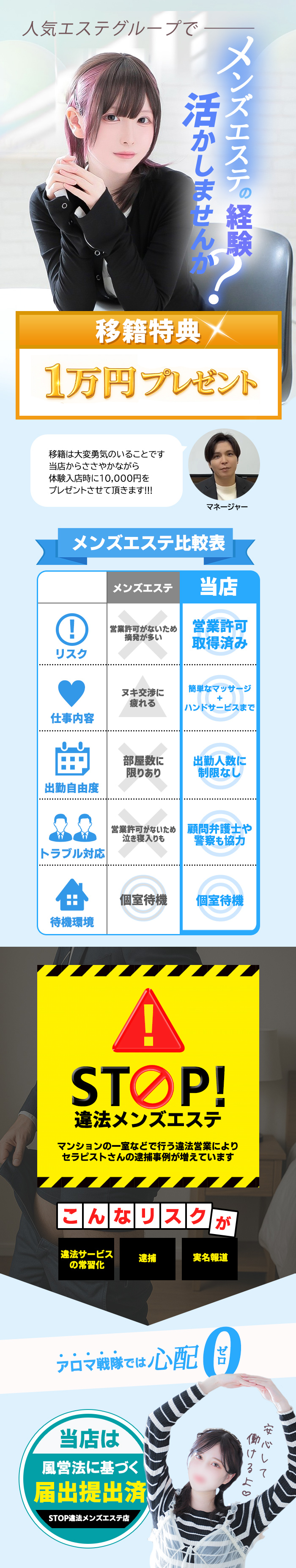 ソフトサービスなのに稼げるお店☆アロマ戦隊です!! 【舐めない・脱がない・触られない】 佐賀で一番ソフトサービスを売りにしたお店です☆ 未経験の方もしっかり稼げる高額バック率80%♪ しかも体験入店初日から!! 不安な方の為にサービス開始前にお客様に こちらで用意した書面に サインをいただいてから サービス開始になります!