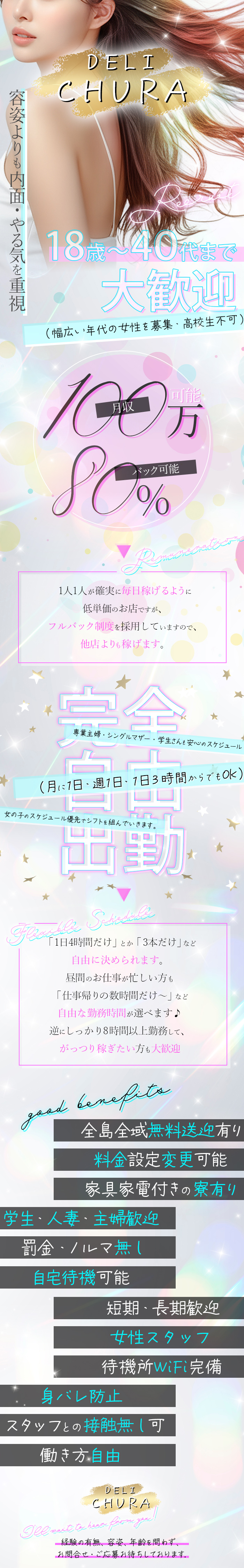 | 勤務日 | 短期・長期・アルバイト可。面接後の体験入店も可。月1回・週1回出勤でも大歓迎です♪ |