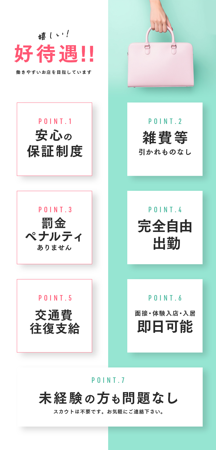 副業やWワークを歓迎しているお店だよ。時間が許す限りガンガン働いていお金を稼ぎたい女の子にはありがたいよね。シフトの入れ方にはお店ごとに決まりがあるから、詳しい条件は問い合わせてみよう♪