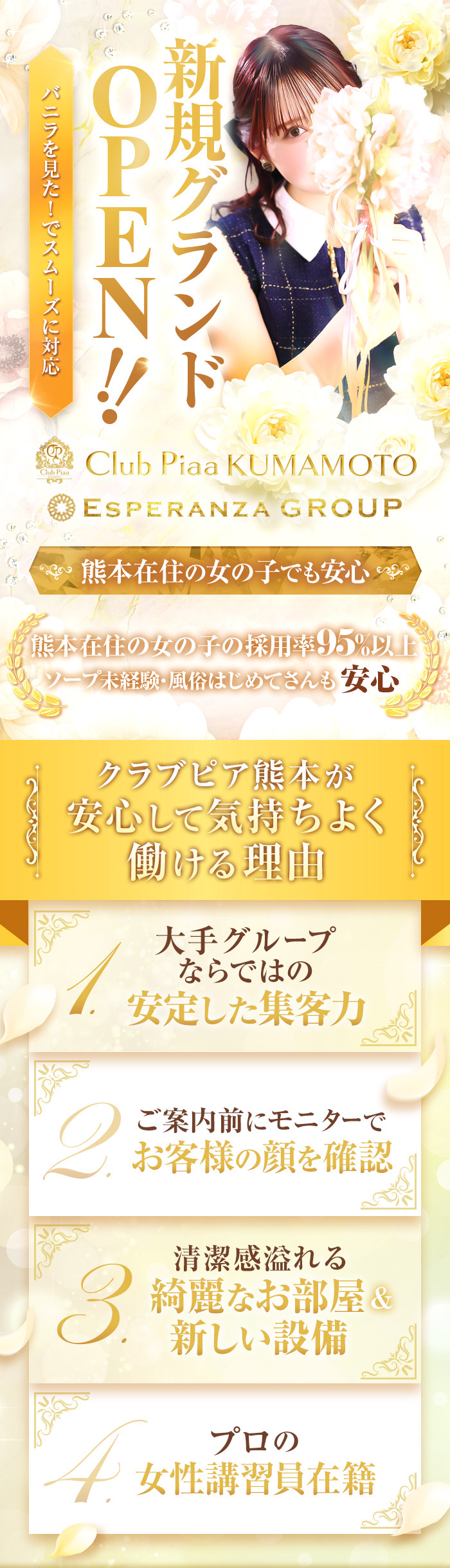 中洲最大級のエスペランサグループが遂に熊本に上陸! 【出稼ぎ2か月待ち】のお店を作り上げたノウハウをさらにアップデートして熊本に参りました! 大手グループだから可能な稼ぎと環境で一度チャレンジしてみませんか? 経験者を稼がせるのは当たり前、経験・未経験関係なく稼げるようになるのが【エスペランサ熊本】です。 【なぜエスペランサグループが選ばれるのか?】 ①根拠のある確かな集客力 どんなに良いスタッフがいても、部屋が綺麗でもお客様が来なければ始まりません。 我々はあらゆる分野から女の子一人一人に合ったアプローチをかけ確実な集客を実現します。 ②十分過ぎるバックアップ体制 当グループは全国に14店舗を展開するグループです。 この規模になれば、講習・WEB制作・画像修正などあなたの稼ぎやスキルアップに欠かせない各分野のプロが 存在しあなたの夢や目標に最短で到達できるように全面バックアップしていきます。