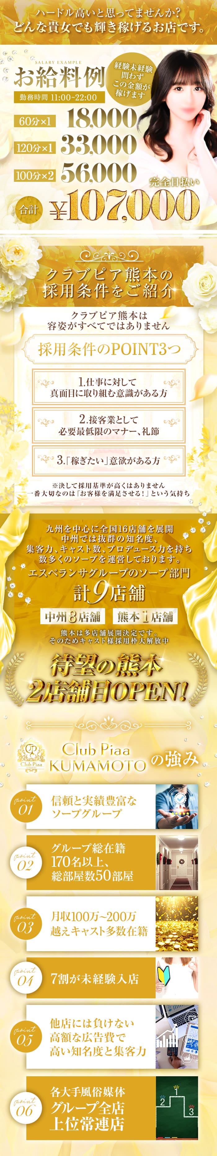 この度、エスペランサグループでは熊本エリア2店舗目となる新店舗「クラブピア熊本」のオープンが決定いたしました。それに伴い、オープニングキャスト・店舗スタッフを大募集しております。現在店舗は、内外装の準備段階となっておりこれから本格的にお店づくりを進めていきます。既存の内装も非常に綺麗な状態ですが、さらに改装工事を行い、より洗練された空間へと生まれ変わります。新しく綺麗なお店で働きたい方には絶好のチャンスです。■未経験の方も大歓迎業界未経験の方でも安心して働けるようスタッフがしっかりサポートいたします。経験者の方は、これまでのご経験や実績を考慮し給与面・待遇面など優遇いたします。■オープニングメンバー募集新規オープンのため、スタートラインは全員同じです。人間関係も一からのスタートなので、働きやすい環境でお仕事を始めることができます。■まずはお気軽にご相談ください「話だけ聞いてみたい」「自分に合うか相談したい」そんなお問い合わせだけでも大歓迎です。少しでも興味をお持ちいただけましたらぜひお気軽にご連絡ください。スタッフ一同、皆さまと一緒に新しいお店を作り上げていけることを楽しみにしております。たくさんのご応募を心よりお待ちしております。