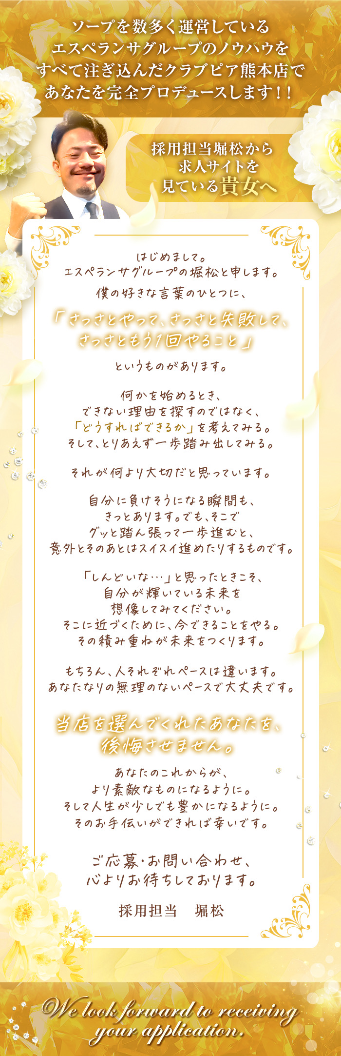 THE ESPERANZAのオープンまでに 私達は7年かかりました 誰もが手を出せなかったお店、誰もが憧れたお店・・・ 私達は今、【日本一のソープランド】を目指し 本気で挑んでいます。 馬鹿げてる、夢物語と思われるかもしれません。 ですが諦めません!本気の挑戦だからこそ 色んな一流の方たちが力を貸して下さっています。 私達が本気だからこそ本気の女性達と働きたい! そう考えております。 また、魂を宿す接客にも挑戦しております。 究極のサービスの奥深くには心があり 心の満足は結局の所、心でしか写しえれないと考えております。 貴女は今、本当に満足していますか? あの時思い描いていた自分になっていますか? どこかで何かを諦めたことをもう一度、 あの時の気持ちに戻って自分自身と向き合ってみてはどうでしょう。 又、自分がどこまでやれるのか試したい、挑戦したいという方も 大歓迎でございます。 私達もまだ夢半ばです 共に日本一の目指してくれませんか?
