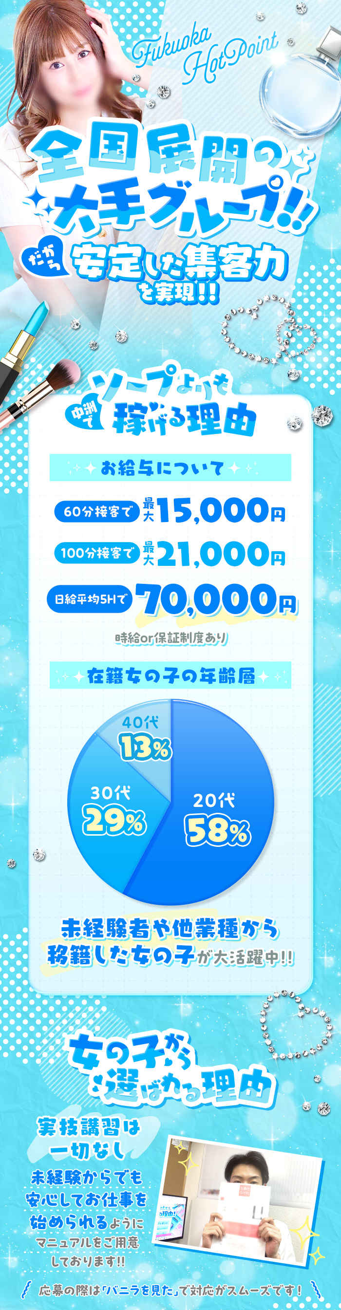 | 応募資格 | 20歳~40歳位までの女性募集中※未経験者大歓迎 |