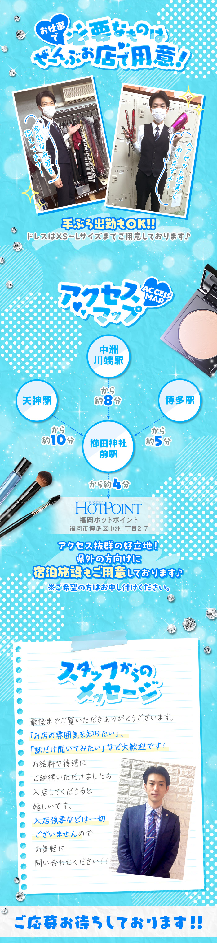 いつも福岡ホットポイントの店長ブログをご覧いただきありがとうございます!!スタッフちゃんやまです。【衣装も全てお店でご用意しております】ですので最初はご自身でご用意して頂くものは基本的にありません他にもお店がご用意・貸出しているものとしてドライヤー・ヘアアイロン(ストレート・カール両方有)髪留め・ヘアゴム生理用品等(急な生理の時の為)などなど大体のものはお店でご用意しておりますのでお気軽にお申し付けくださいただあると良いのは保湿クリーム(ボディクリーム)化粧品ご自身の使いやすいヘアアイロン等々、普段使っているアイテムなどあれば更にお仕事しやすくなると思います。初期投資はもちろん無し顔付身分証+本籍地入り住民票があれば即日勤務・給料全額日払急な出費もこれから貯金していきたい貴女も集客も抜群にいいです、という1円でも多く稼がせるをモットーにしております質問等もお気軽に貴女が輝いてお仕事が出来るお店そして安心して仕事が出来るお店それが福岡ホットポイント!!