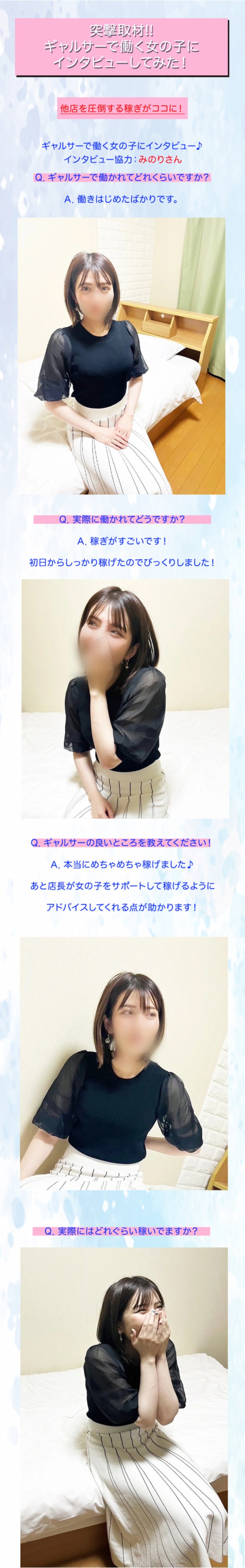 店長さんの丁寧な対応が入店の決め手に!集客力の高さも実感!同店に応募した際は業界未経験だった“うるみ”さん。1つひとつ丁寧に対応してくれる店長さんのおかげで、当初の不安が安心感に変わったと話す彼女。「やっていくうちに徐々に覚えていけるから大丈夫」と背中を押してもらえたことが入店の決め手になったそうです。また日々の来店数が多く、収入面も大満足なのだとか。