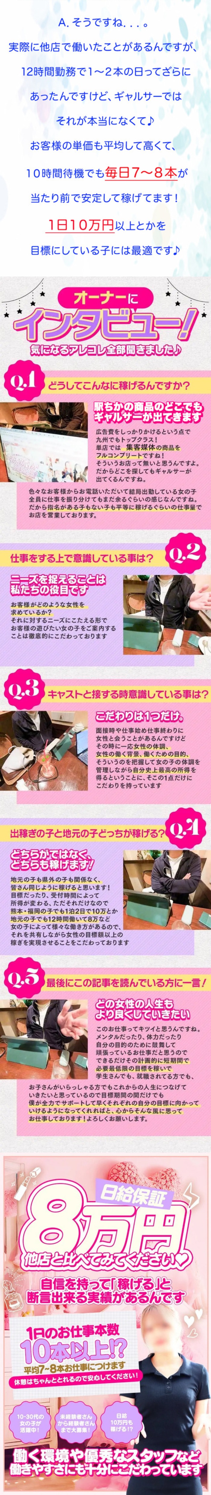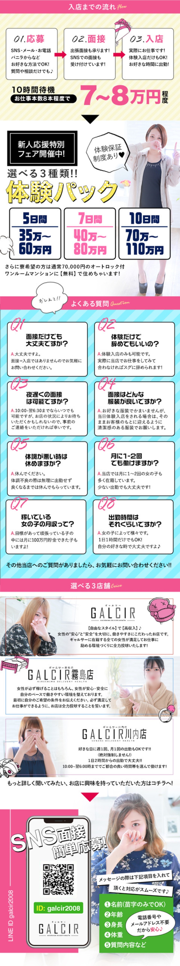 お店によって条件は異なりますが 当店はお約束した金額をしっかりとお支払いしてます! 解らないことや疑問点は面接時に何でも聞いて下さいね。 お問い合わせをお待ちしております。 LINE ID:GALCIR2008 是非お問い合わせお待ちしております♪ TEL 090-5082-2354