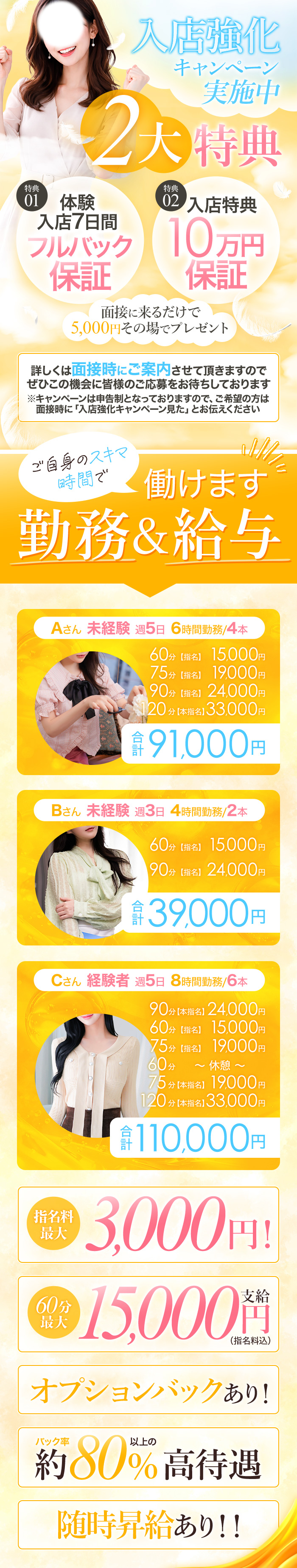 今回は特大キャンペーンをご紹介! いま当店に入店していただくと、最初の3日間はフルバック。 お客様から頂戴した金額を、全額女の子にお支払いします。 さらにそこから3ヶ月間は10%還元のおまけ付き! その月のお給料総額の10%分が上乗せされるなど、稼ぎやすい企画を実施中です。