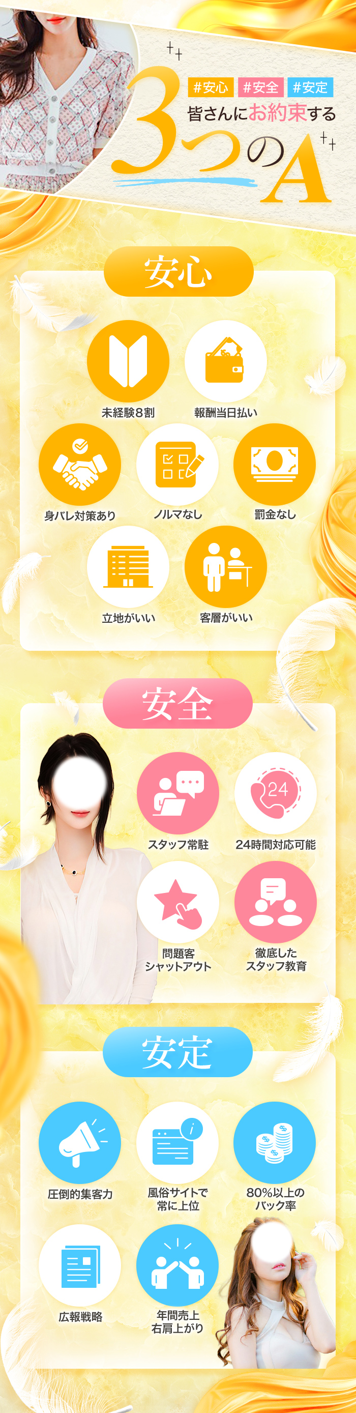 大手グループが経営しているお店だよ。待遇や条件も手厚くて安心だし、集客力もあって女の子が稼ぎやすい!待遇や条件はグループの中でも店舗ごとに変わってくるから、気になるポイントは問い合わせて聞いてみよう♪
