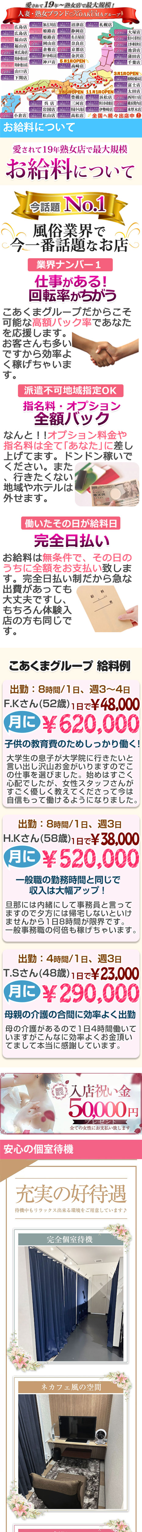 業界最大手クループ 人妻・熟女日本最速 5年で全国42店舗出店!! 『入店祝い金5万・地域最高額バック・最低給料保障・面接交通費全額支給・業界最大手クループだから出来る好待遇』 ボーナスシステム導入! 出勤ボーナス最大10万円 貴女の頑張りをお給料とは別にボーナスでさらに還元! 19年以上の信頼実績がある『こあくまな人妻たち』の2号店『こあくまな熟女たち』 がオープンしました!! 広島で19年運営している【こあくまグループ】は稼ぎやすさはもちろん、働きやすい環境を整えています。 未経験の方はもちろん、経験者の方も大歓迎です。 30代・40代、50代、60代の方を中心に募集してますのでお気軽にお問い合わせ下さい。 また70代まで応募受付中です!