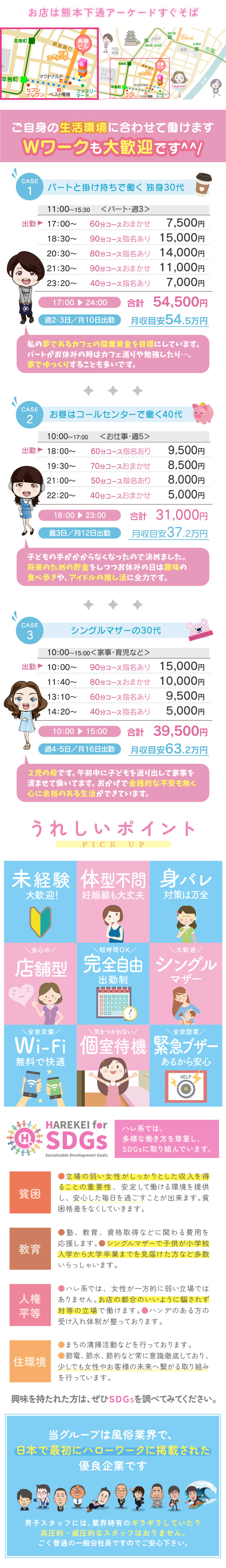 💖熊本ハレ系で『予約が1番入る』から稼げる💖 🌈可愛く・楽しく・ガッツリ稼ぐ🌈 〜未経験の女の子が活躍できる安心安全のお店〜 【新人限定🔰特別ギャラ✨】 入店から1ヶ月間、ギャラ500円🆙になります♪ ※採用された女の子全員が対象になります。 マジックミラーでのお客様確認やアリバイ会社🏢 での各方面対応で、家族バレ、知人バレを完全に シャットアウト🙅♂️!安心して働けます! SNS相談📲✉️は大好評随時受付中🙆♂️! 不安や疑問はすぐ解決! 全国に38店舗展開しておりますハレ系です♪ 集客力NO.1クラス、働き易さNO.1クラスで あなたの目標をサポートします。 100種類以上ある制服で楽しくお仕事! 可愛い💕制服を着て、楽しく🎶 ガッツリ✨稼げます♪ サービスや容姿よりも雰囲気を重視してるお店 なので初心者・未経験🔰でも簡単に アルバイトを始められます。 もちろんハレ系では指入れ・違法行為は禁止事項 (お客様には事前に了承済みです)!
