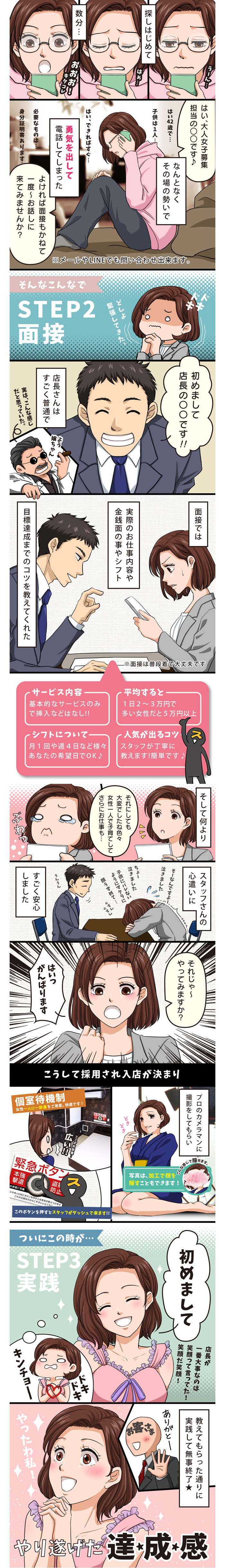 いきなりお店や事務所で面接をするのは不安な女の子などのために、お店のスタッフさんが喫茶店などに出向いて面接をしてくれるシステムだよ♪お店によっては地方の女の子でも、会いに来てくれるようなので気軽に相談してみよう!