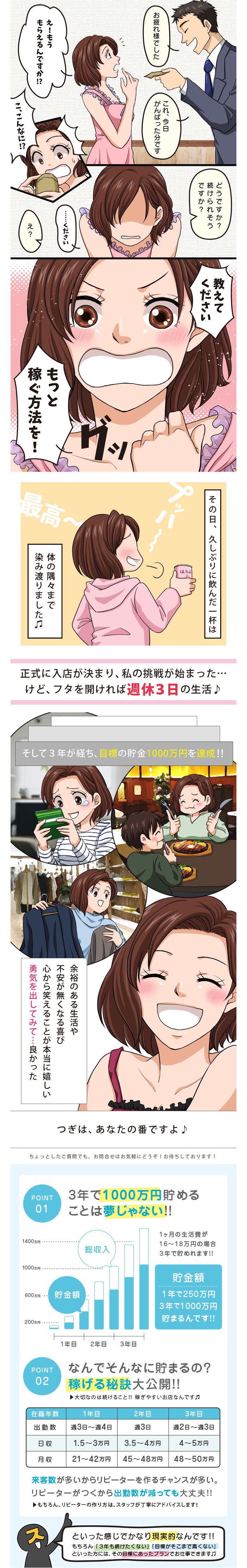 全くの未経験から入店をしましたがサポートがしっかりとしているので安心してお仕事ができました。当初は数ヶ月勤務して辞める予定でしたが居心地が良くて2年以上お世話になっております。女性の事をしっかりと考えてくれるのでとても助かっております。