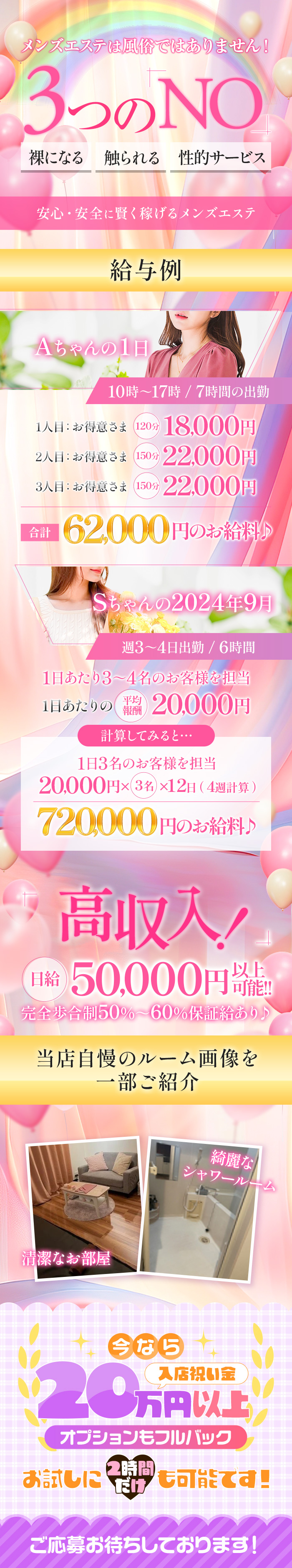 高収入!日給5万円以上可能!! 嬉しいお給与保証あり 女性店長がお仕事までしっかりサポート 御祝い金20万円 |