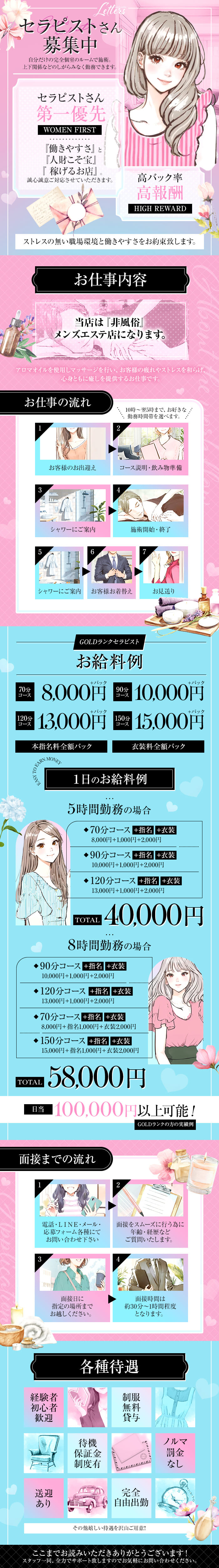 当店ではご新規のお客様だけではなく、 すでにお店のリピーターになってくださっているお客様も 多数いらっしゃいまして、現状としてお客様からの お電話の割合に対してセラピストさんが 圧倒的に不足しております(ノД`)・゜・。 なので、稼ぎたいセラピストさん大至急募集中です!!! また、当店では割引等のキャンペーンを行い集客力を高めておりますが、 セラピストさんの基本給への影響は一切ございませんのでご安心して 働いていただけます♪ 正直お店の取り分が1000円~3000円などになっても 女性へのお給料は変わらず支給させていただいております(*^^)v 『損して得とれ』のことわざ通り、お店が損してでもセラピストさんに稼いで頂く事で セラピストさんの施術技術や接客技術また、お店全体の品質向上に繋がることだと 考えております。セラピストさんがイキイキして輝けるようなお店を目指しております。 経験者の方は面接後の即日入店や体験入店も行っておりますし、 未経験者の方には女性講師による親切丁寧な研修を行っておりますので、 ご安心してお問合せご応募お待ちしております♪ 出張面接などもしておりますので お気軽によろしくお願いします(#^.^#)
