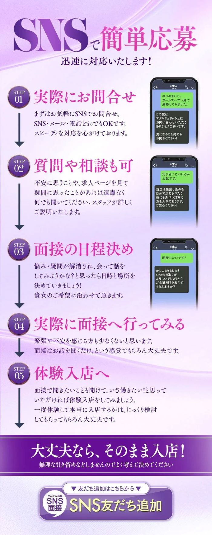 面接から体験入店は一緒に可能です ただ 当日問い合わせからの面接&体験入店となると 当店もいろいろと入店の準備が必要となりますので、 事前にご連絡をいただくことをお奨めいたします