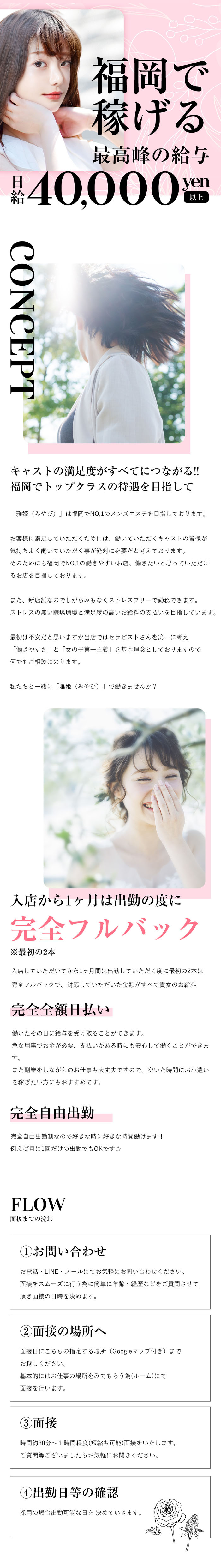 キャスト募集完全日払いOK!!日給40,000円以上も可能!?安心のバック率♪指名全額バック・1本8,000以上その他に昇給など多数ご用意♡非風俗メンズエステです♪相談・交渉当店は風俗店ではございません。ルーム施術につき個室待機も可能常にスタッフが傍に常駐しておりますので安心して勤務が可能です。♡ここが大事です♡風俗店で勤務をお考えの方!少々お待ちください。当店は一般エステになりますので脱がない・舐めない・触られないは当たり前♡例)派遣風俗1件・・・6,000円~10,000円正直、店舗数が多すぎて年々女子給は下がっているようにお聞きします。例)当店「雅姫(みやび)」1件・・・6,000円~10,000円風俗サービス無しで最低でも6,000円は稼げます。年々、風俗もメンズエステもバック率は変わらなくなっています。現在でも、風俗店には【お給料】で勝る事はできませんが・・・肝心なことは!♡体は資本♡・風俗店で勤務をお考えの方・業界未経験者の方・顔出しをしたくない方・相談・質問がある方まずは一度、体験入店だけでもOKです。お気軽に質問LINEだけでもお待ちしてます。無理は絶対させません!不安な点やわからない事がありましたらお気軽にお話ください!!♡LINEは24時間受付中♡求人ダイヤル090-7004-2021メールアドレスf.miyabi2021@gmail.com