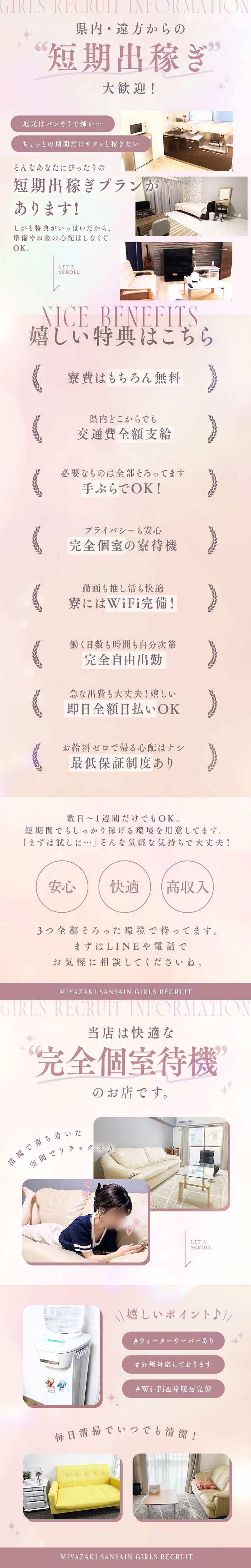 「通うには遠いな~」とか「引っ越ししたいな~」そんなときでも、お店が契約しているマンションを寮・宿泊施設として用意をしてくれるよ☆だから面倒な手続きもないし、家賃が無料や格安で、支払いも給料引きだったり融通が聞くから、必要な人は詳しく聞いてみてね♪