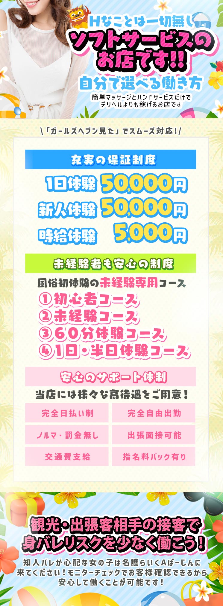 手を使うだけ・見ているだけ・または女の子が受け身にならなくてOKなソフトサービスメインのお店だよ♪初心者の女の子には始めやすいお仕事だね!コースによってサービスの違いがあるお店もあるみたいだから、お仕事内容は事前に聞いてみよう!
