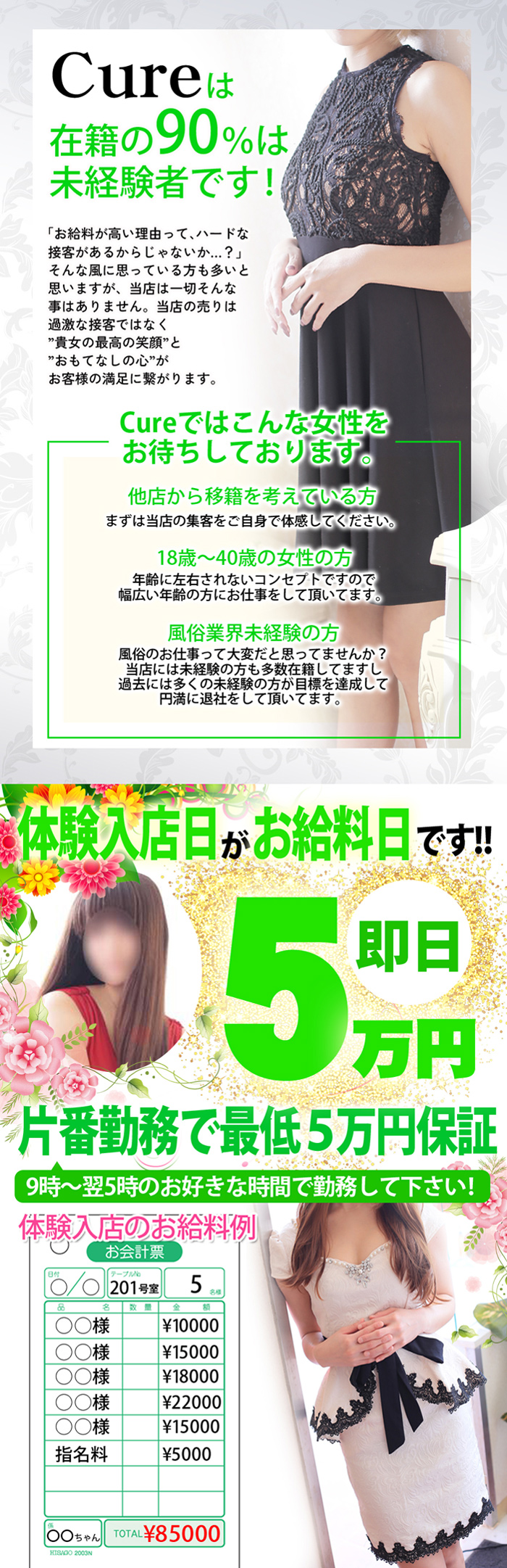 ⇨店長のひとりごと^.̫.^⇦☆入店すると最低保証5万円がついてくる☆〖年齢〗〖経験〗〖容姿〗〖体型〗などの条件は一切なし!★ルックスやスタイルに自信がなくても、写真掲載できなくても、写メ日記できなくても大歓迎♪当店で『稼げる女の子』の基準はカワイイ女の子・スタイルのいい女の子ではなく『一生懸命な女の子』または『親切な女の子』です♫特別な物は必要としていないので他店さんの面接に落とされた方も安心してお問い合わせ下さいね(@^^)店長からの追記太ってて落とされた・・・。容姿で落とされた・・・。待遇で落とされた・・・。勤務日・時間で落とされた・・・。コンセプトで落とされた・・・。など!いろいろな理由で不採用になった方をキュアは大歓迎!!採用率99%なので気軽にご連絡下さい☆