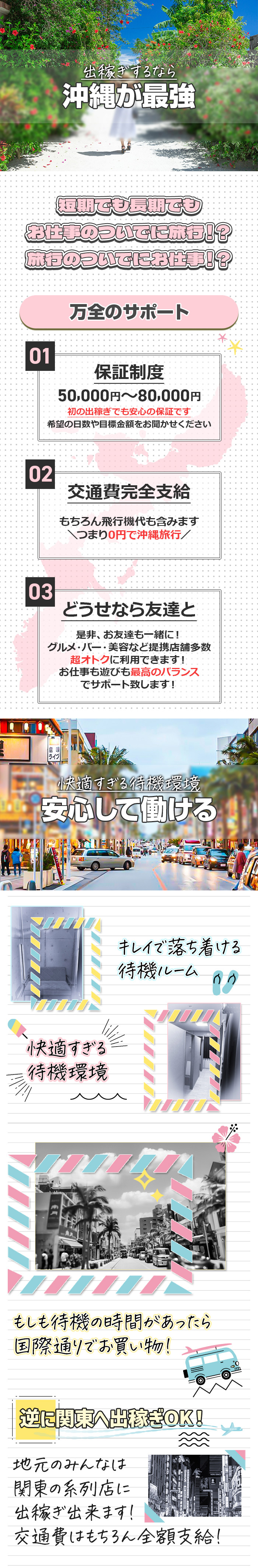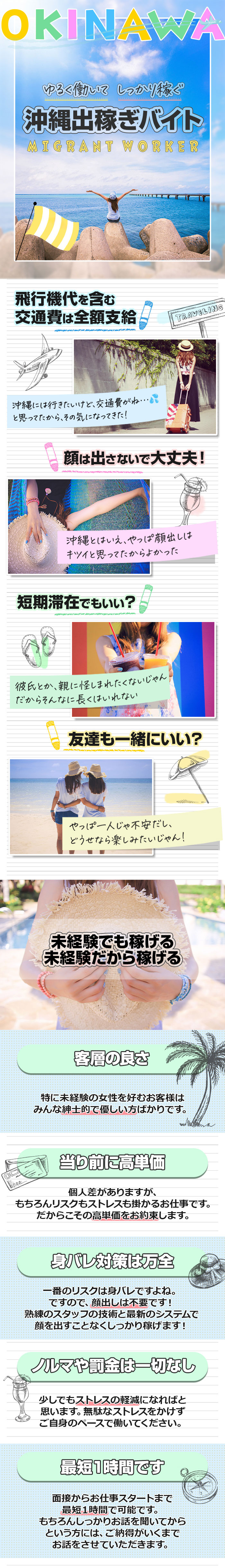 | 交 通 | 出稼ぎの場合:5日間以上の勤務で片道の飛行機代はお店が負担します※10日間以上の勤務で往復支給します。在籍の女性でもガソリン代、交通費など負担しておりますのでお気軽にご相談くださいね♪ |