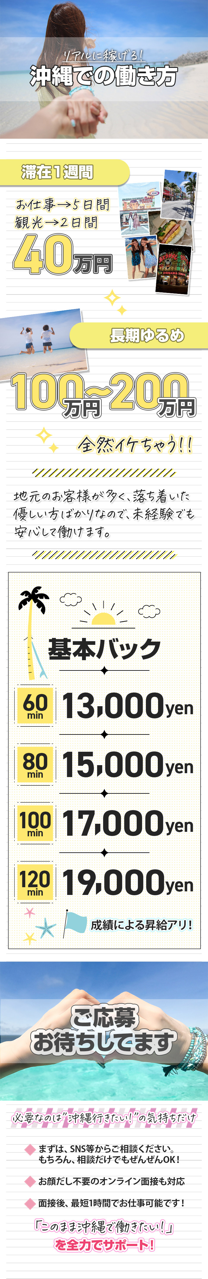 はいさい~!うちなんちゅー大集合✨高待遇で女の子大募集!ガチ新店!今入る子=初期メンバー🔥派閥・上下関係、一切なし😎うちなんちゅー大歓迎!身バレ対策しっかり👌出稼ぎ組もウェルカム🔥「楽しく働いて、しっかり稼ぎたい」そんな子、今がチャンス🔥新店の今が一番アツい!乗り遅れたら後悔するかも💥ピンときたら即連絡📩🔥