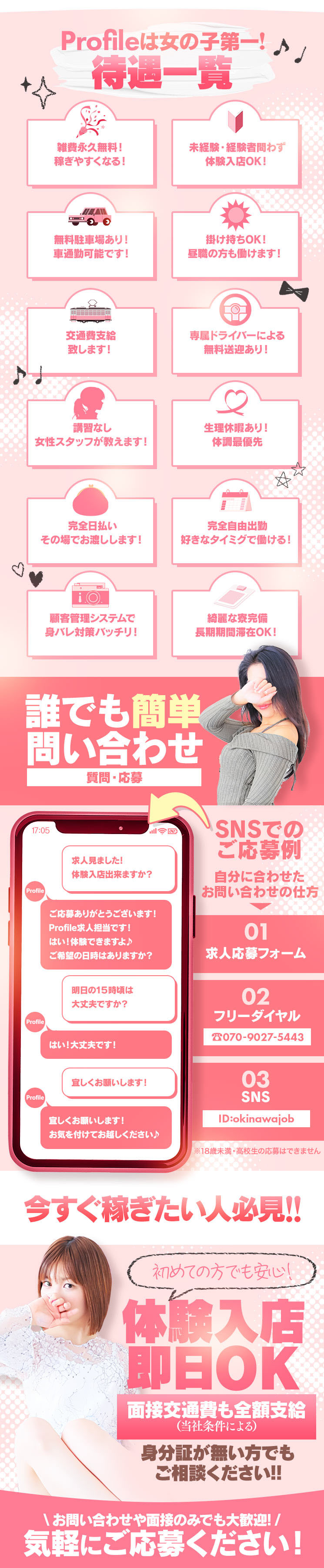 おはようございます‼︎副店長の宮平です‼︎おはようございます‼︎副店長の宮平です‼︎Profileは年中無休で絶賛求人大募集中です♪タイトルの件ですがもし今働いているお店に不満のある方、他のお店が気になる方がいらっしゃいましたら是非一度プロフィールで体験入店してみて下さい‼︎お給料などの待遇もそうですかProfileはスタッフの対応に自信がありますよ‼︎現在も移籍組の女の子がいますが他店様から移籍してきた最大の理由は「スッタフの方と合わなかった」からなんですProfileは女の子からドライバーさんの評判がとても良く安心して仕事にむかえると言っていただいてます♪優しく気遣いのできるドライバーさんがたくさんいますよ♪もちろん事務所内もアットホームな雰囲気で緊張や気遣いさせるような事はありません!さらに早番帯にも遅番帯にも女性ドライバーさんが出勤してるので同じ女性として悩み事とか話やすかもしれませんね♪体験入店だけで構いません!