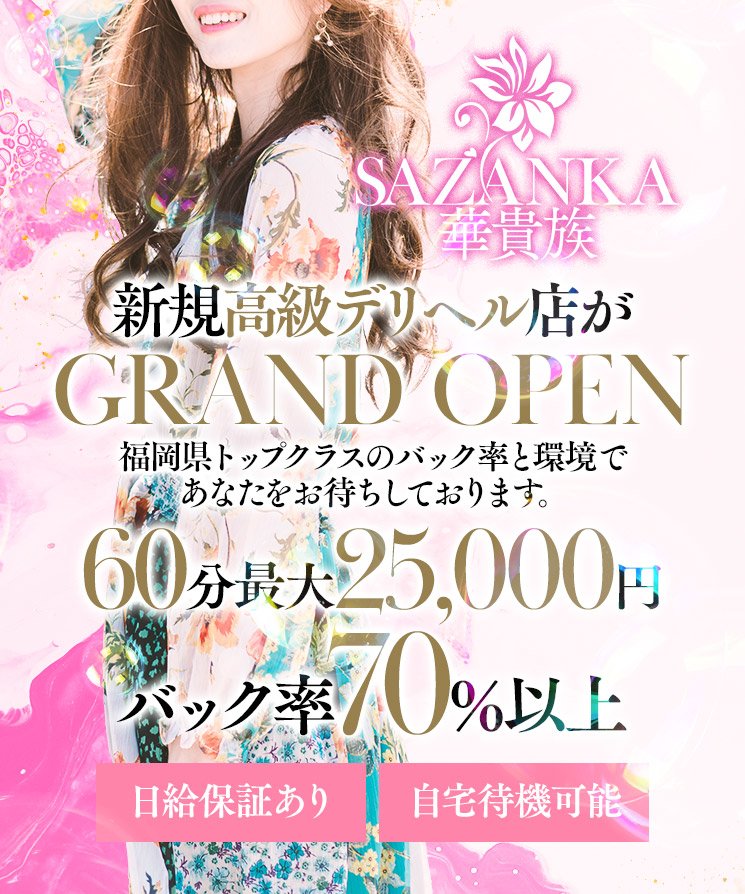 SAZANKA~華貴族GRAND OPEN!! 女の子大募集中でございます!! 面接にお越しいただくだけで1万円お渡しいたします!! 入店祝い金20万円!! 10日間フルバックで100万円狙えます!!