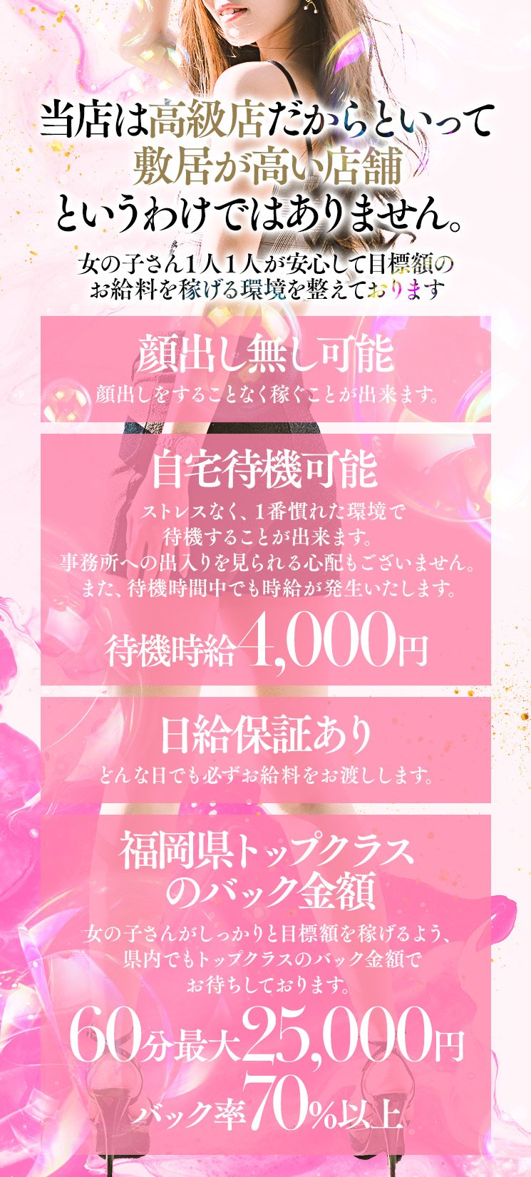 高級感のあるサービスをお客様に提供するお店だよ。女の子に求められる接客レベルが高くなる分、待遇も手厚くてしっかり稼げるからやりがいがあるよね。お店ごとに高級店ならではのルールもあるから、詳しい条件は問い合わせて聞いてみよう♪