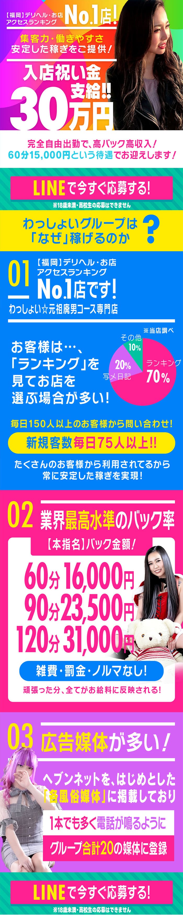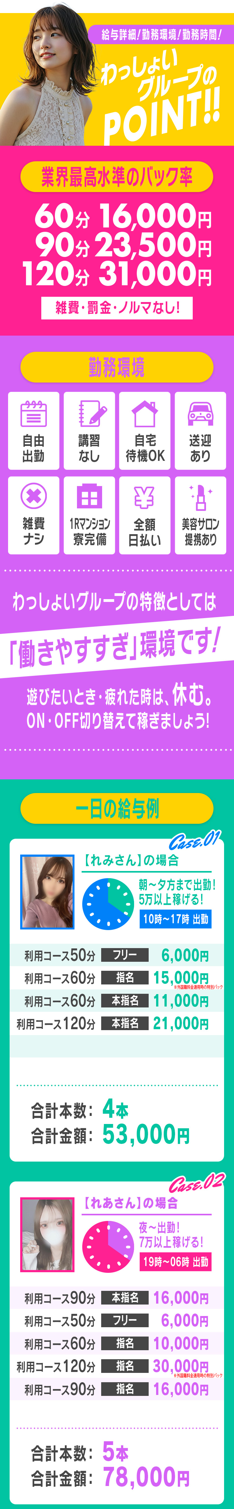 「稼ぎたいけど、怖い…」そんな子にこそ見てほしい!“安心・安全・高収入”が揃った【わっしょいグループ】が、🎁超お得な3大特典キャンペーン中🎁🌟わっしょいグループ限定✨豪華3大特典とは?🎁特典①:面接交通費《1万円支給》来るだけで1万円💸!話を聞くだけでもOK♪🎁特典②:入店祝い金《最大30万円》期間限定で“全員”に支給🎉スタートからしっかり稼げる安心感!🎁特典③:安定して稼げる高額バック【全員対象のバック】・60分 :11,000円・90分 :16,000円・120分 :21,000円+インセンティブあり✨【シティヘブントラベラー専用バック】・60分 :16,000円・90分 :23,500円・120分 :31,000円+インセンティブあり✨❌️雑費・罰金・ノルマ…一切なし❌️「せっかく頑張って働いたのにこんなに引かれちゃうの…🥺💦」なんてこと、うちは一切ありません✋頑張った分はまるっとお給料に反映!💬詳細は面接で!でも今動かなきゃ損かも?待遇・環境は面接時にしっかりご説明します🙌この特典は《期間限定》です!⚠️枠が埋まり次第終了となります⚠️