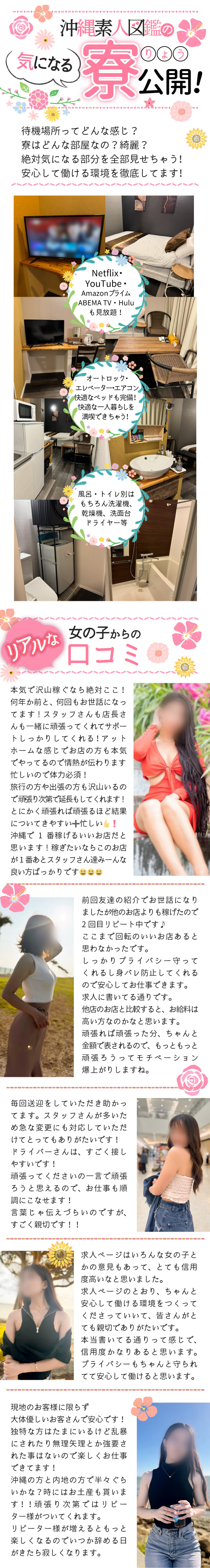 やっぱり沖縄は人も土地もあたたかい!寮も至れり尽くせり!過去に沖縄を訪れたときに感じた、あたたかな土地柄が忘れられず、同店に応募した“つばさ”さん。「ほんわかしたお客様が多いですし、スタッフさんも優しい。安心して接客できます」と笑顔も見せていました。また、セキュリティがしっかりした寮も◎。各種アメニティが用意されているおかげで、快適に過ごせるそうです。