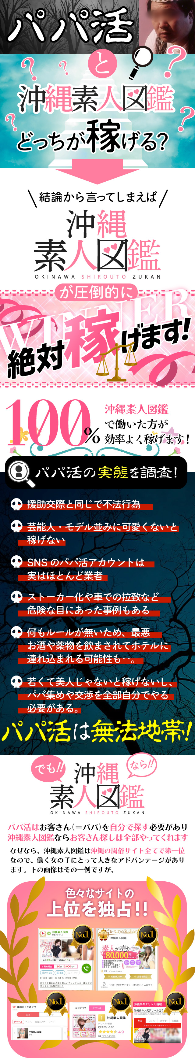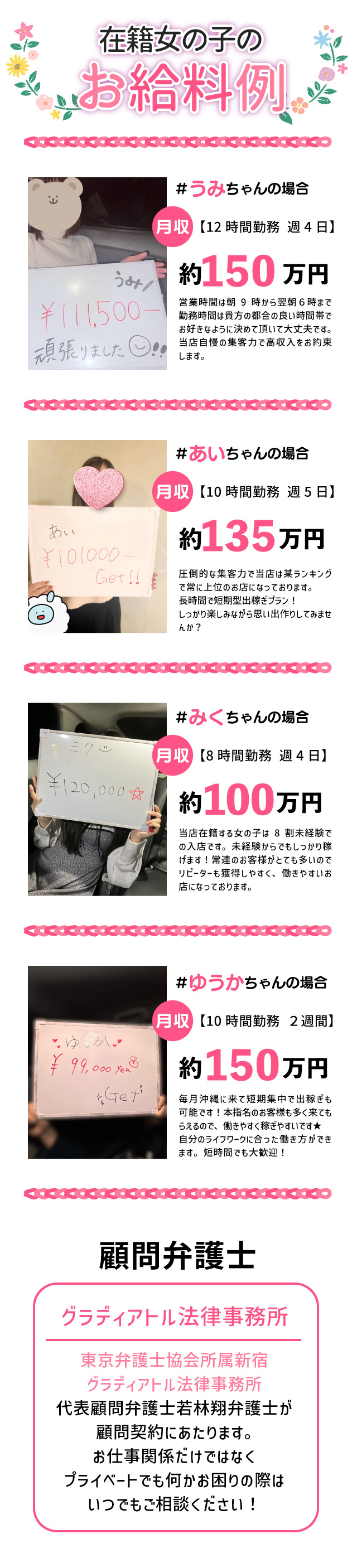 沖縄唯一の顧問弁護士契約店、沖縄素人図鑑です🎉お仕事のことはもちろん、プライベートや家庭の悩みまで無料で相談可能✨女の子が安心して働ける環境作りを徹底しています💪働きやすさと心の安心を大切にした当店で、まずはお気軽にお問い合わせください😊